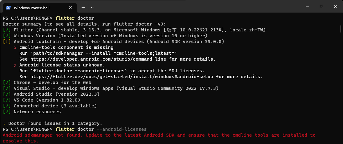 [✓] Flutter (Channel stable, 3.13.3, on Microsoft Windows [version 10.0.22621.2134])